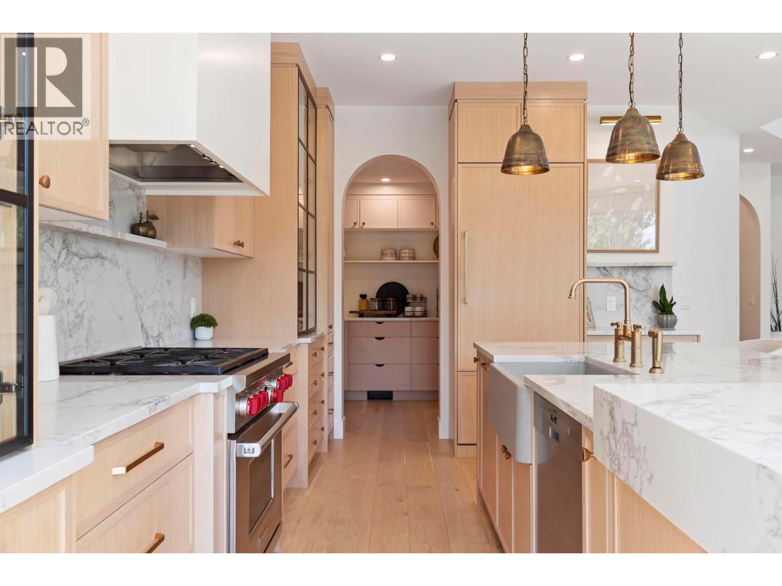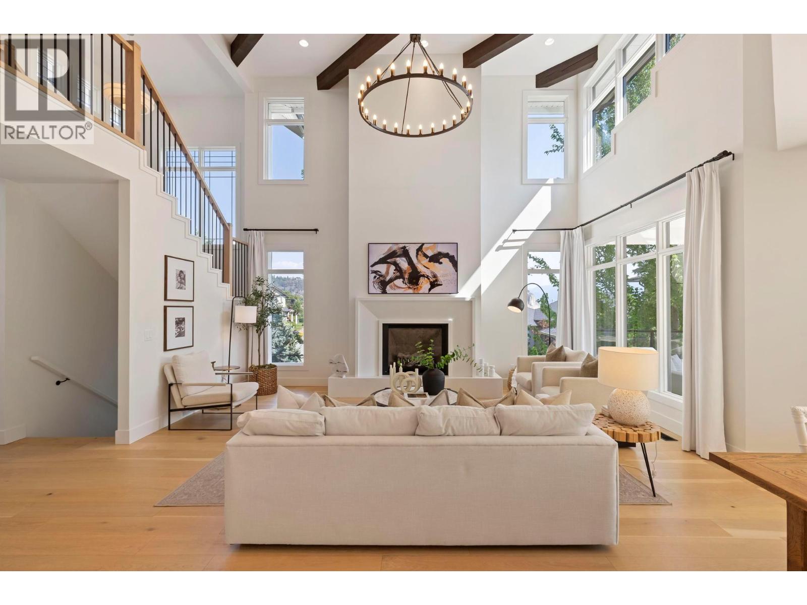 This exceptional luxury home is nestled on a quiet cul de sac in Kelowna’s prestigious Glenmore neighbourhood and was reimagined in 2023 by an award winning design and build team. Offering over 5,000 sq ft, it is ideal for elegant entertaining and multigenerational living. The stunning living room features soaring 18 foot vaulted ceilings, wide plank white oak flooring, statement wood beams, archways, and refined European inspired finishes. The custom chef’s kitchen includes integrated appliances, a six burner Wolf gas range, custom white oak cabinetry, quartz counters and backsplash, and an oversized walk in pantry. A main floor office with custom built ins overlooks the backyard. Upstairs are four generous bedrooms, including a primary retreat with private balcony, spa inspired ensuite, soaker tub, walk in shower, and walk in closet. The private backyard oasis offers a saltwater pool, hot tub, stamped concrete patio, gas fire pit, lush landscaping, and a full size basketball court that converts to a winter skating rink. RV parking and space for boats or trailers is included. Additional highlights include a movie room, private gym, triple garage and a flexible one or two bedroom walkout in law suite that is ideal for family, guests, or a mortgage helper. Minutes to downtown Kelowna and walking distance to schools, parks, and shopping, with mountain and sunset views and Sonos sound throughout. A rare Glenmore offering that combines luxury, lifestyle, and functionality. (id:6770)