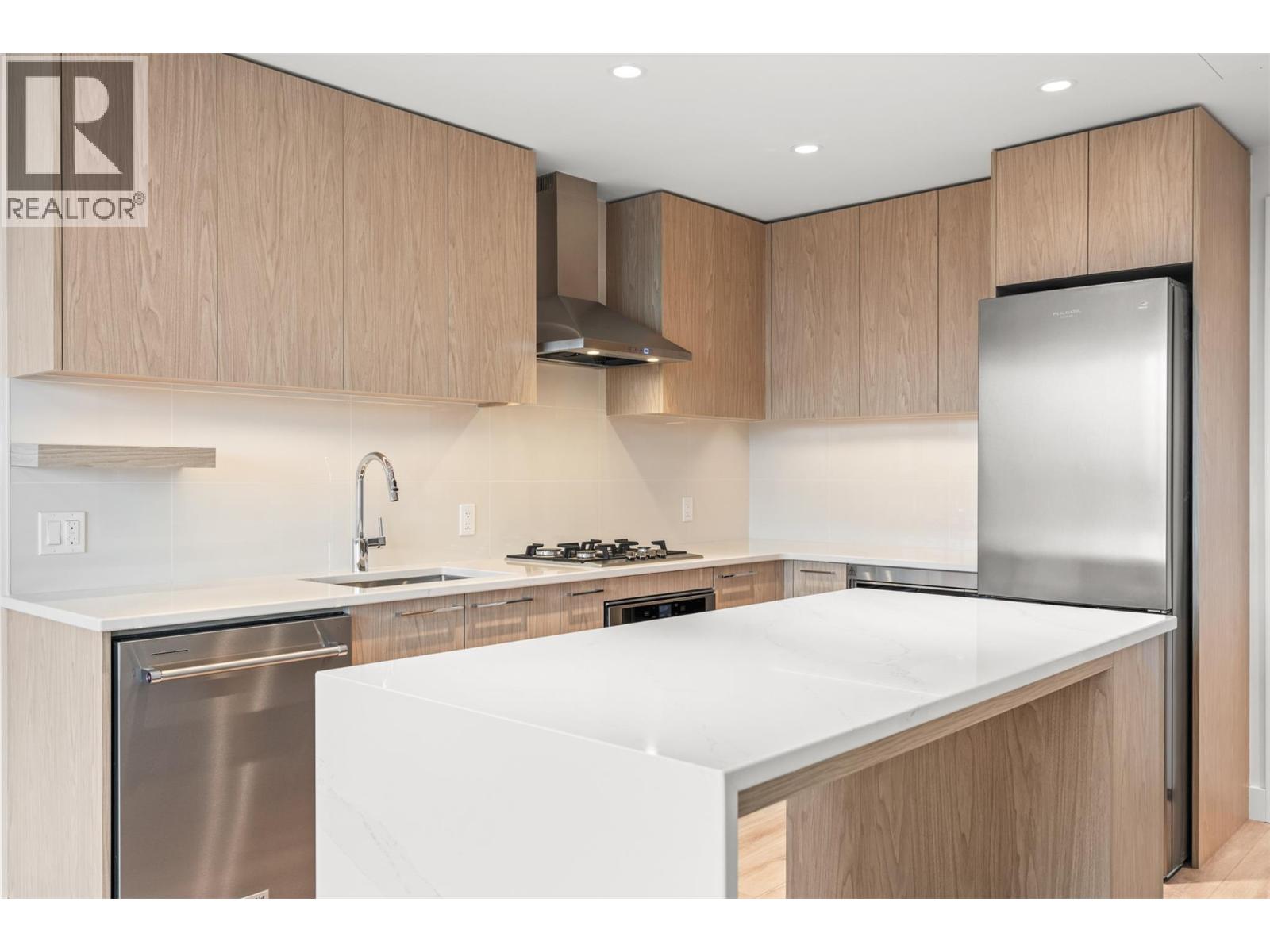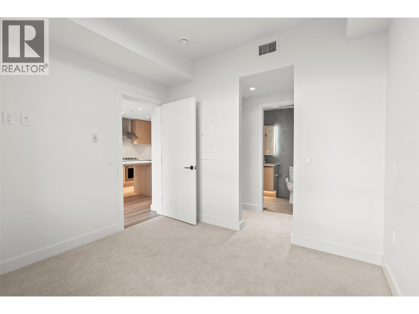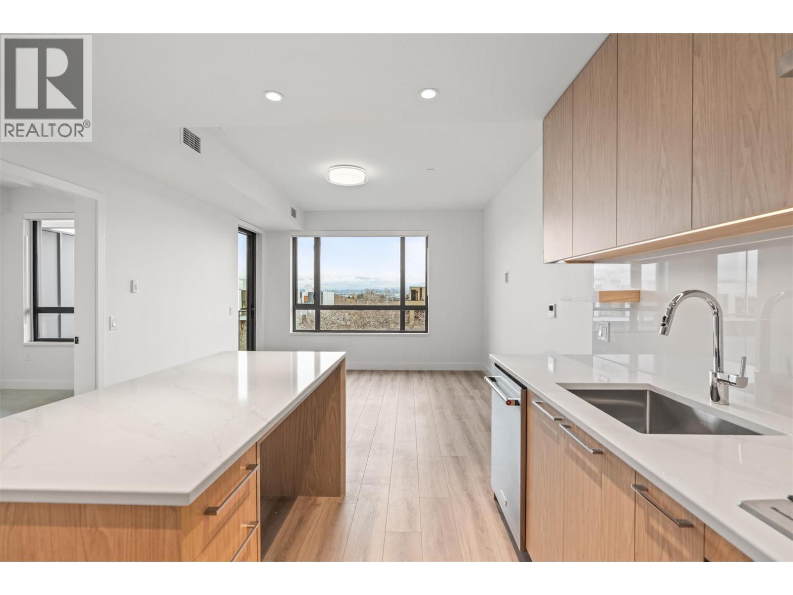 Introducing ALMA, proudly crafted by Mission Group. This 5th floor east-facing 1-bed, 1-bath home is filled with beautiful morning light, offering 540 sqft of interior living plus a 100 sqft terrace, seamlessly pairing intentional design with elevated finishes in the heart of the Lower Mission. The striking kitchen features sleek flat-panel wood-grain cabinetry, a dramatic quartz waterfall dining island, and premium stainless-steel appliances. The open-concept layout is perfectly suited for everyday living and effortless entertaining, enhanced by expansive windows that flood the home with natural light, durable laminate flooring through the main living areas, and plush woven broadloom carpeting in the bedroom. The primary suite boasts a walk-through closet, while the ensuite showcases large-format tile, a rainfall shower, custom-tiled niche, and soft ambient lighting that creates a retreat-like escape. Additional highlights include roller shades on every window, individually controlled heating and cooling, and one secure underground parking stall. Residents enjoy access to amenities including an 8,000 sqft lakeview terrace with firepits, BBQs, and community gardens, plus a fully equipped fitness centre, dog wash, and bike maintenance station. With a walk score of 93, you’re just steps to transit, KGH, the shops and dining of vibrant Pandosy Village, and the shores of Okanagan Lake. Sqft and room sizes are approximate and may vary. This newly constructed home is move-in ready (id:6770)